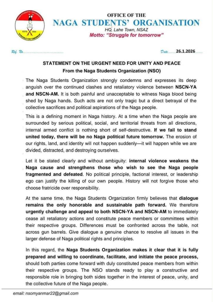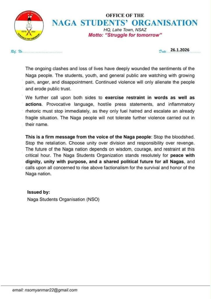 စစ်ကိုင်းတိုင်း၊ နာဂကိုယ်ပိုင်အုပ်ချူပ်ခွင့်ရဒေသမှာ နာဂလက်နက်ကိုင် ၂ဖွဲ့ကြား အပြန်အလှန်တုန့်ပြန် ပစ်ခတ်တိုက်ခိုက်နေမှုကို နာဂကျောင်းသားများသမ္မဂမှ ပြစ်တင်ရှုံ့ချပြီး နှဖက်တွေ့ဆုံညှိနိုင်း ဆွေးနွေး အဖြေရှာကြဖို့ ဇန်နဝါရီလ ၂၆ ရက်နေ့က ထုတ်ပြန်ထားပါတယ်။